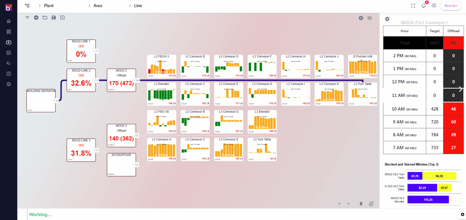 Designed for large, complex operations, BEET Enterprise gives manufacturers visibility from the plant level down to individual devices and motions. It combines real-time data capture from existing factory equipment, AI-driven insights and a flexible plant-to-asset architecture that integrates seamlessly with existing MES, ERP and IT systems to enable enterprise-wide operational intelligence. Key capabilities include: